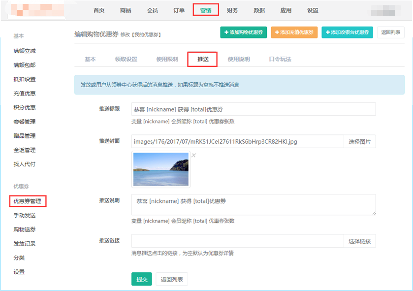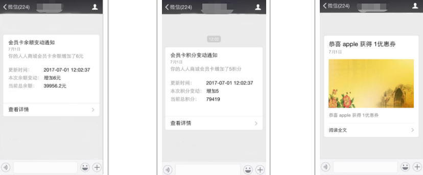 * 您领取会员卡激活的时候,如果您设置了赠送积分、余额,那么关注过公众号的会员就会收到系统默认发送的消息提醒,这个是系统默认的,不需要您自己设置,获得优惠券也会得到通知,但是这个通知是需要您自己设置的,设置位置如下图: