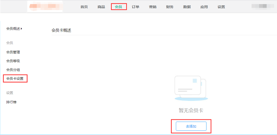 * 设置入口位置:会员——会员卡设置,点击“去添加”按钮,参见下图: