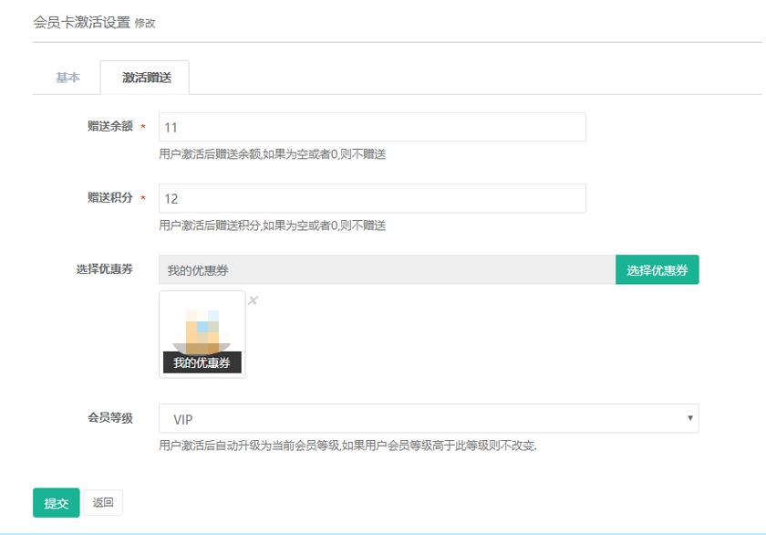* 支持自定义设置赠送余额、赠送积分、赠送优惠券,会员等级设置之后,新客户领取会员卡进入商城,则会到您设置的指定等级,如果已经关注过的商城会员等级高于您设置的指定等级,则会员等级还是按照原来的,不会降低等级。