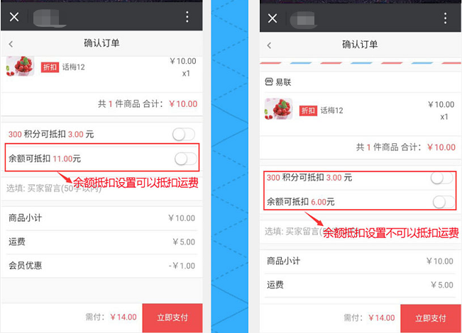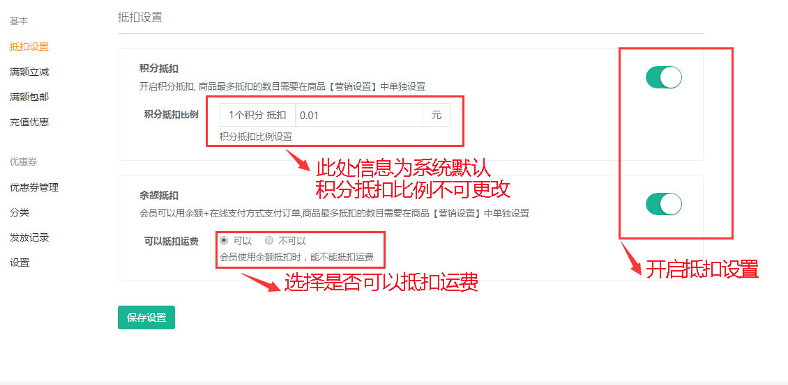 抵扣设置是商城商品开启积分和余额抵扣商品消费额的营销设置,商城中各商品销售价不同此处的积分与余额设置是所有商品统一的设置,最低抵扣数目需在商品【营销设置】中单独设置,某商品需关闭抵扣设置在商品【营销设置】中单独设置为零即可,如在此关闭则全部关闭商城中所有商品的抵扣设置营销,**(温馨提示:所有在【营销】中设置的活动是针对商城所有商品而非只针对某一中商品设置与添加商品中的营销不同)**,参见下图: