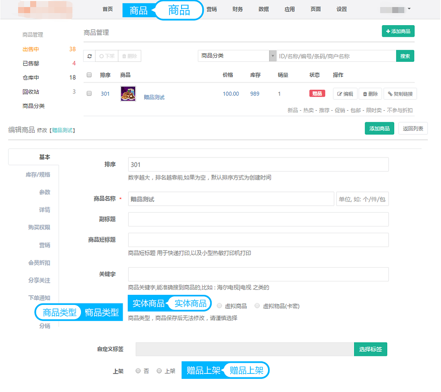 * 需注意的是:添加的赠品一定要是“实体物品”,系统暂不支持“虚拟商品”和“虚拟物品(卡密)”,上架选择“赠品上架”,上架的赠品在前台不会显示,且赠品必须有库存,赠品不设规格,赠品数量同步商品数量。