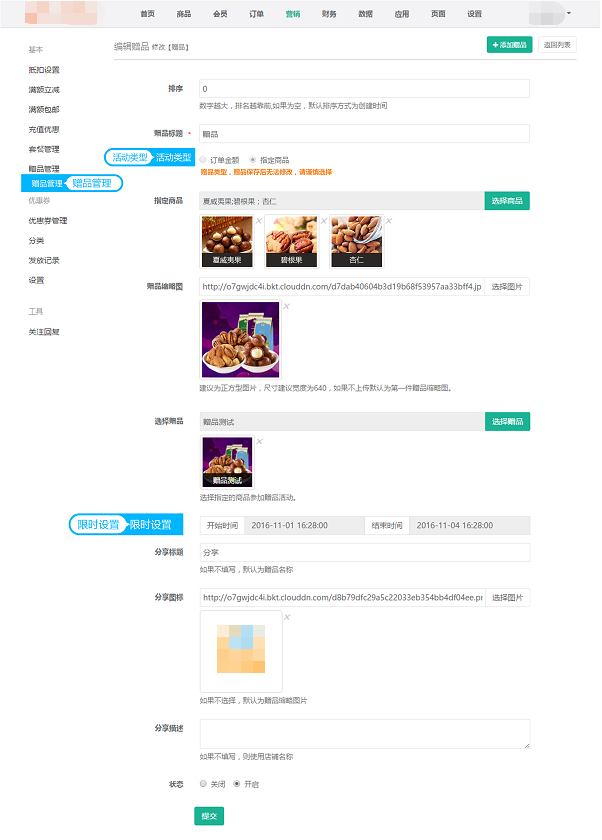 * 设置入口位置:营销——赠品管理——添加赠品(参见下图)
