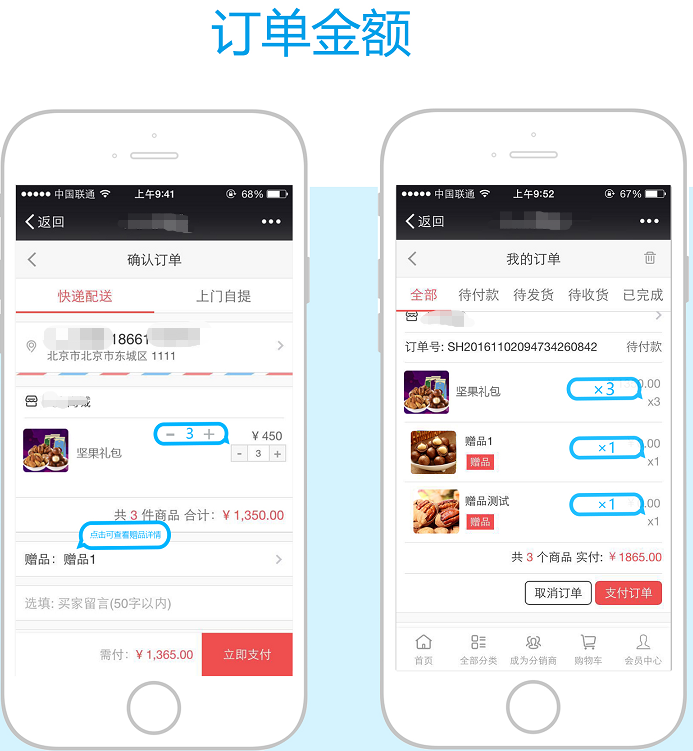 * 订单金额:自定义设置订单金额信息,消费者达到设置的订单金额条件后直接可享受赠品,无论购买几个商品,赠品只能有一个,参见下图: