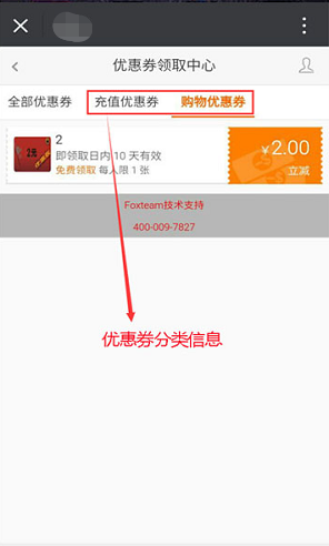 商家通过添加的优惠券分类分别管理相应的优惠券,可设置在前台中显示分类信息,参见下图: