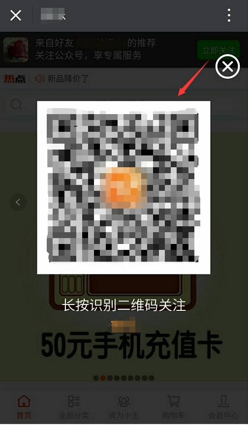 粘贴关注引导页网址,分享至朋友后用户点击关注立即跳转到关注页,如果上传了关注的二维码则优先弹出二维码,如果不设置分销商分享出去朋友点击【立即关注】会无反应,参见下图: