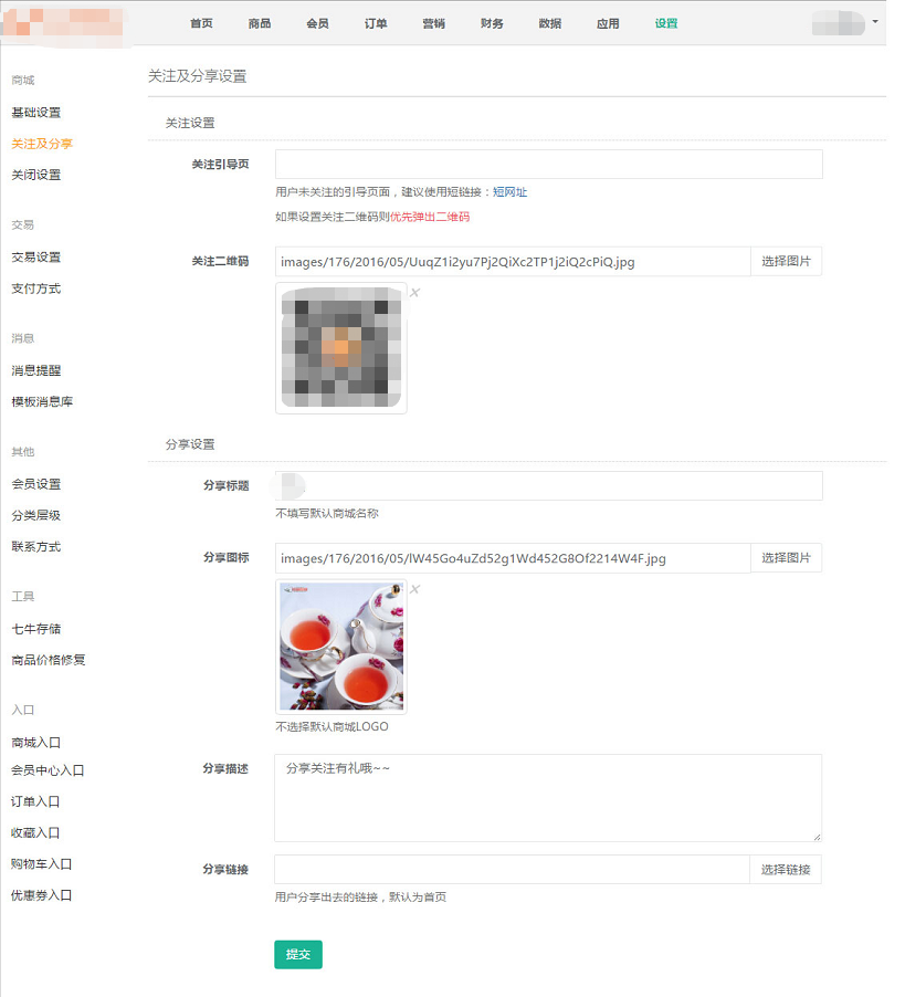 点击【关注及分享】设置关注的引导页、二维码,分享的标题、图标等信息,参见下图: