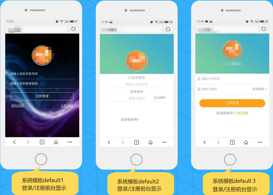 WAP端登录或注册的页系统中有三套模板,在“选择模板”中进行选择使用,也可根据系统自带3套模板数据格式设计自己的模板上传至addons/ewei\_shopv2/template/account/目录下,并且也是在“选择模板”进行选择自定义的模板,以系统自带模板为例参见下图: