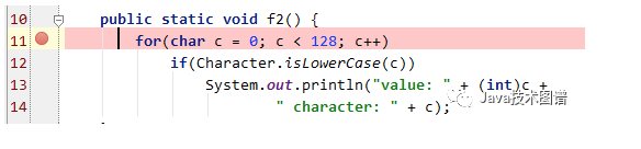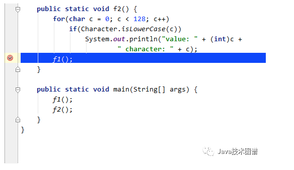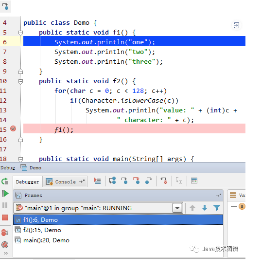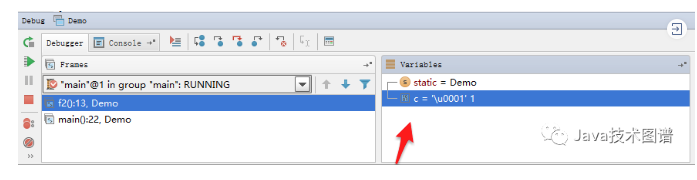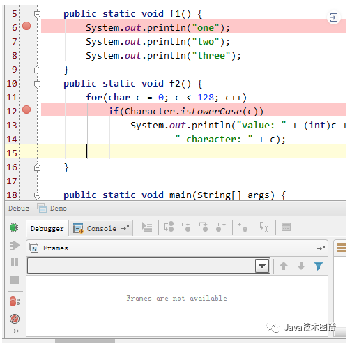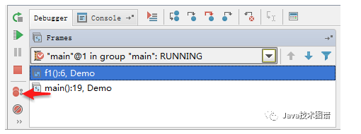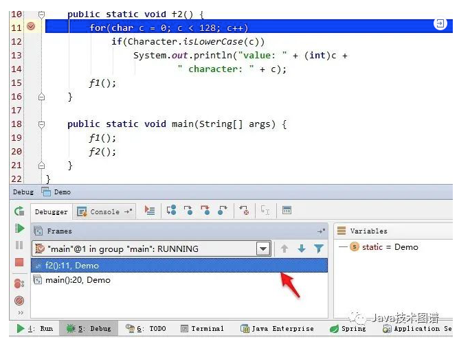 IDE下方出现 Debug 视图,红色的箭头指向的是现在调试程序停留的代码行,方法 f2() 中,程序的第11行。红色箭头悬停的区域是程序的方法调用栈区。在这个区域中显示了程序执行到断点处所调用过的所用方法,越下面的方法被调用的越早。