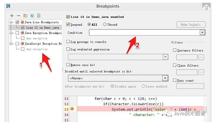 箭头1指向的是你曾经设置过的断点,箭头2可以设置条件断点(满足某个条件的时候,暂停程序的执行,如 c==97)。结束调试后,应该在箭头1处把所设的断点删除(选择要删除的断点后,点击上方的红色减号)。