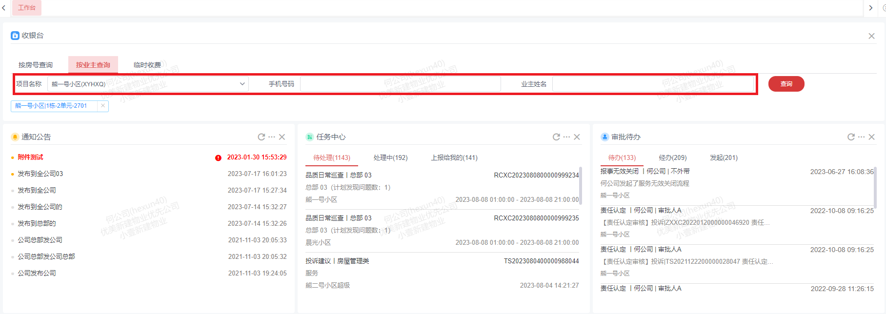 1.在收银台,点击按业主查询,选择项目名称、客户姓名、电话,点击查询。
