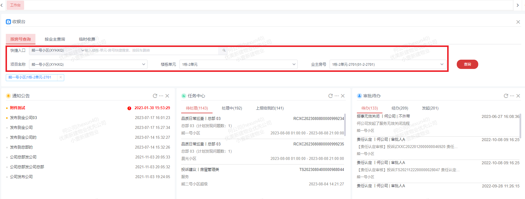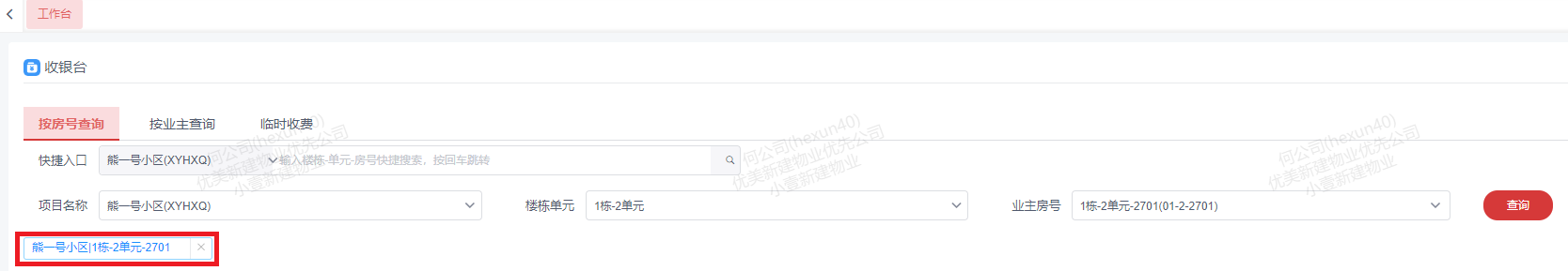 1.在收银台,选择项目名称、楼栋单元、房号,点击查询。