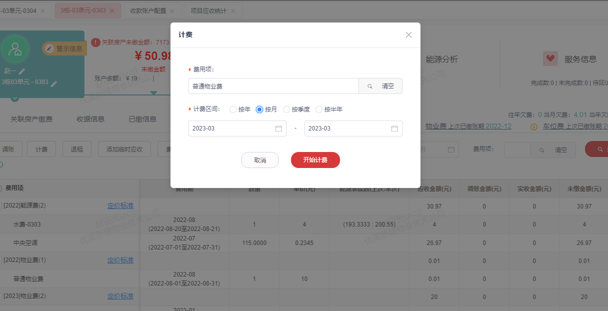 3. 选择需要计费的费用项、费用期、计费区间,点击开始计费;