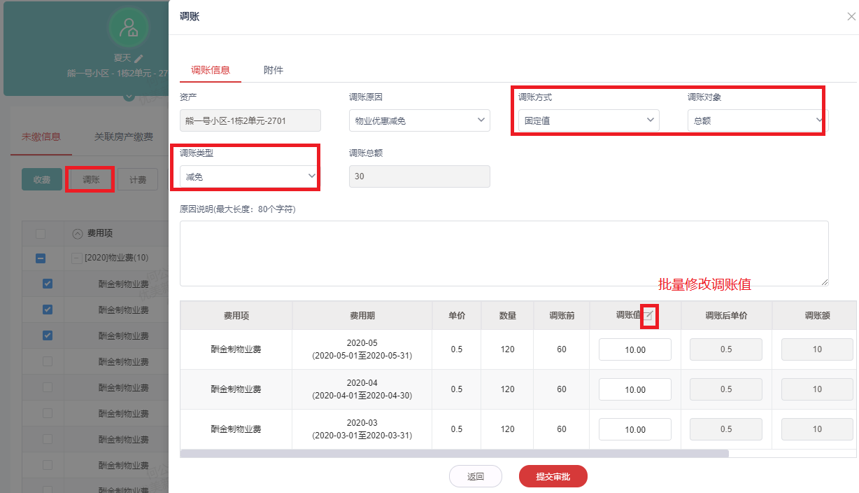 4.选择调账原因、调账对象、调账类型、调账方式、调账原因及调账值,点击**提交审批**按钮;