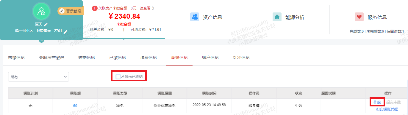 1. 点击**调账信息**页签,去掉“不显示已完结”的勾选框;