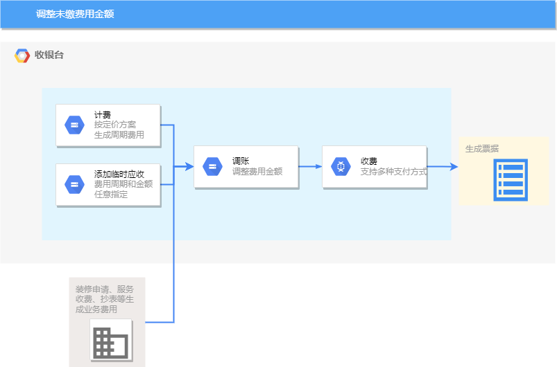 1. 未缴费用已生成。未缴费用一般来自[计费](https://www.kancloud.cn/guide/saasv3/2738695)、[添加临时应收](https://www.kancloud.cn/guide/saasv3/2738697)和业务产生(装修、服务、抄表等)的费用。