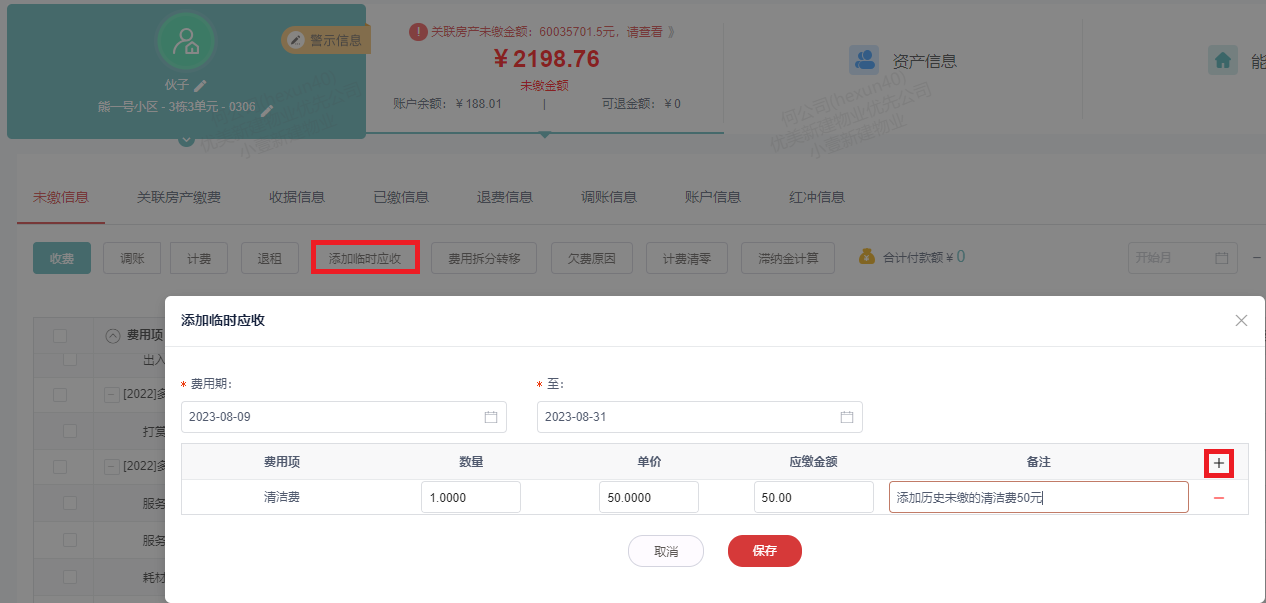 2. 在未缴信息界面,点击**添加临时应收**按钮。