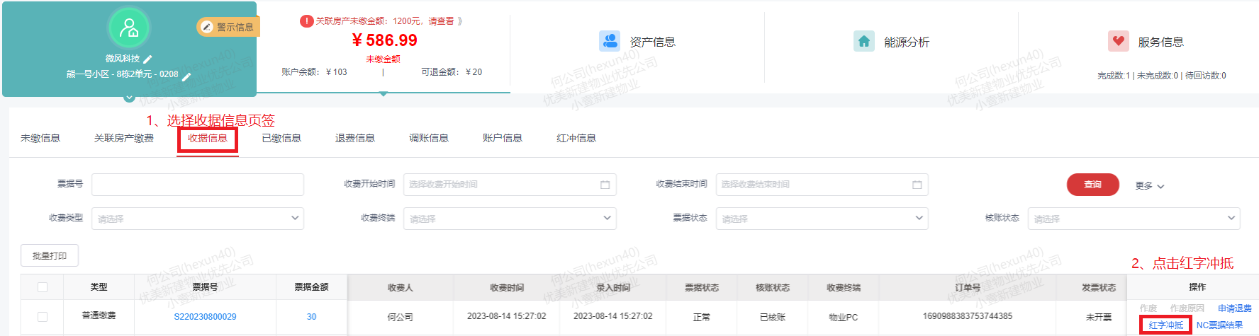 5.进入红冲信息页面,查看该户所有红冲记录。