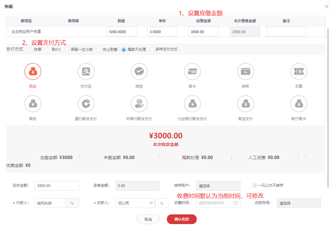 2.填写数量、单价,确认支付方式后,点击**确认收款**。