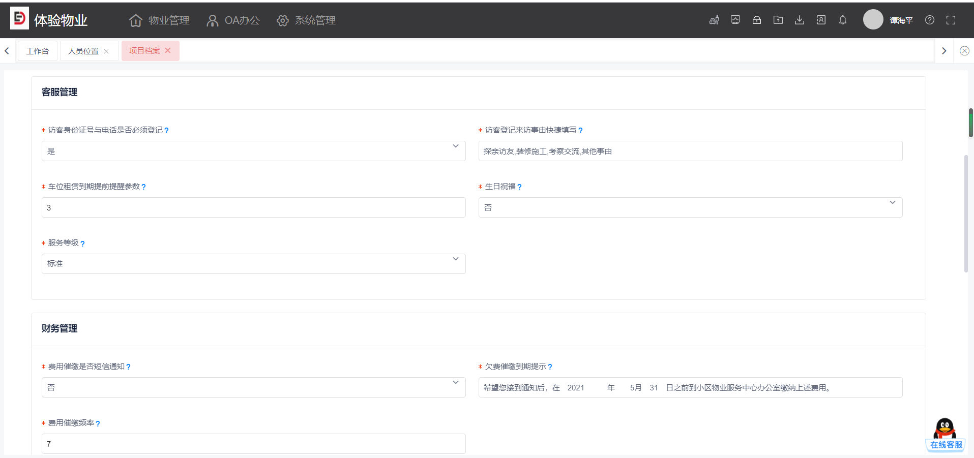 (3)**服务等级**:会关联服务(报事报修、投诉、咨询建议等)的上报提醒机制,关联设施设备任务、品质任务、巡更任务的生成。