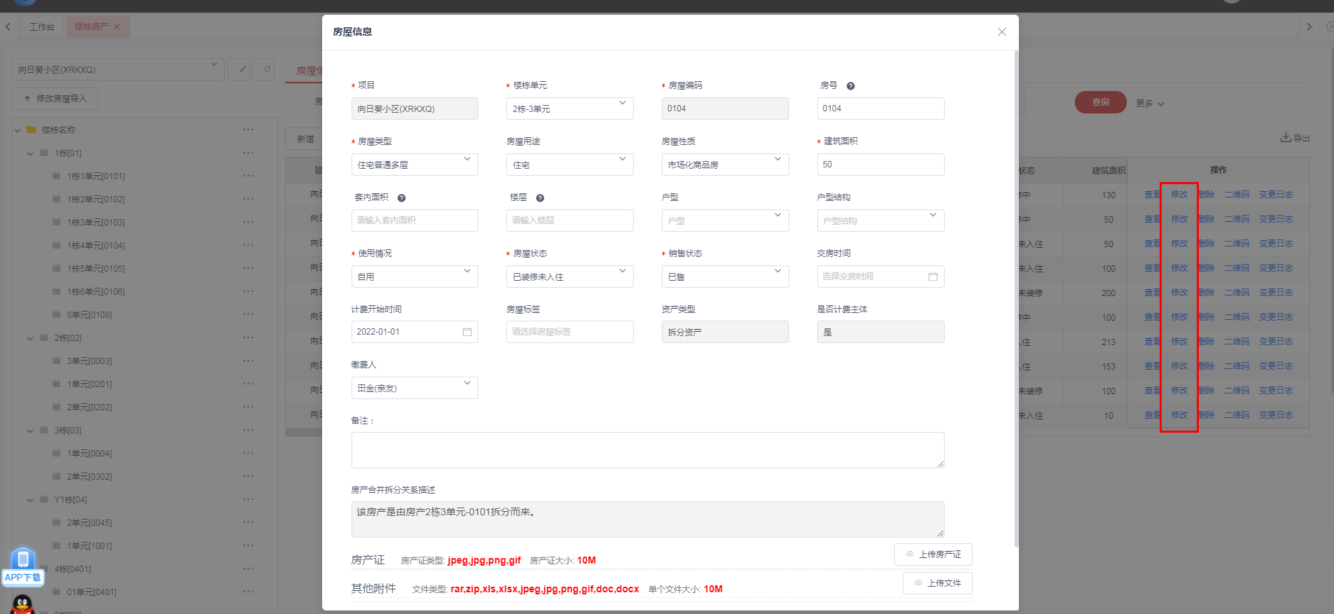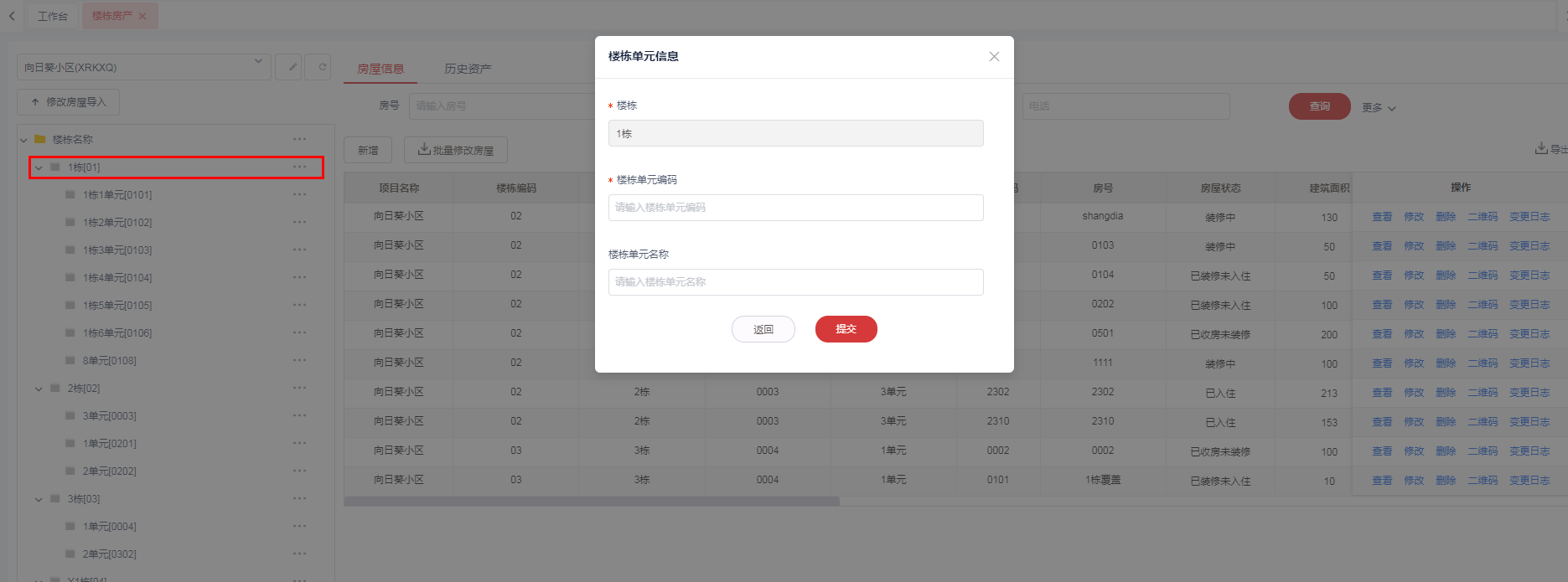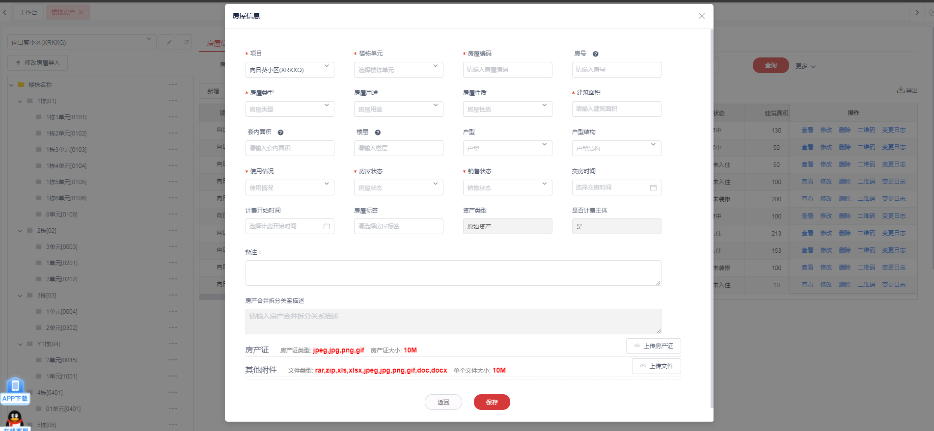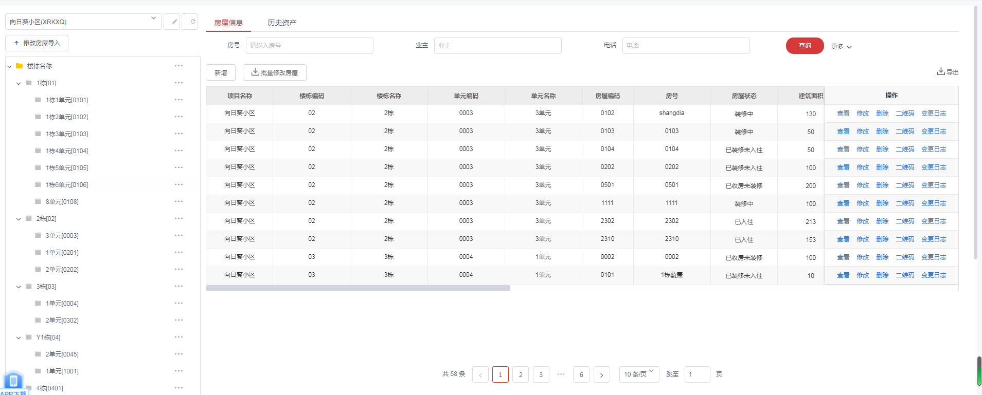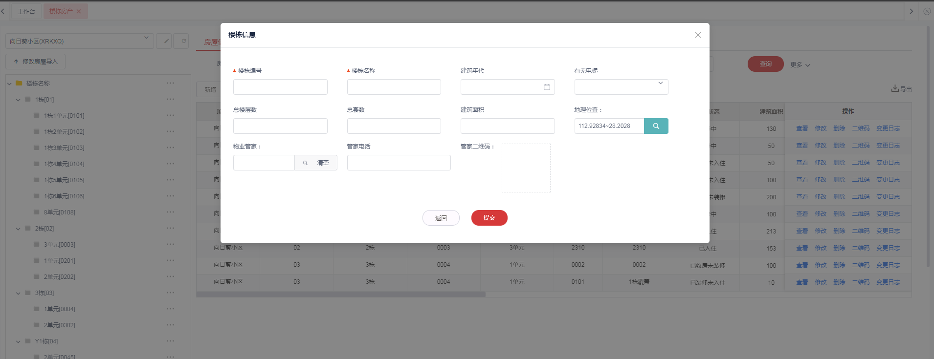 统计项目下楼栋房产,并对其进行增加、修改、删除房屋等操作。