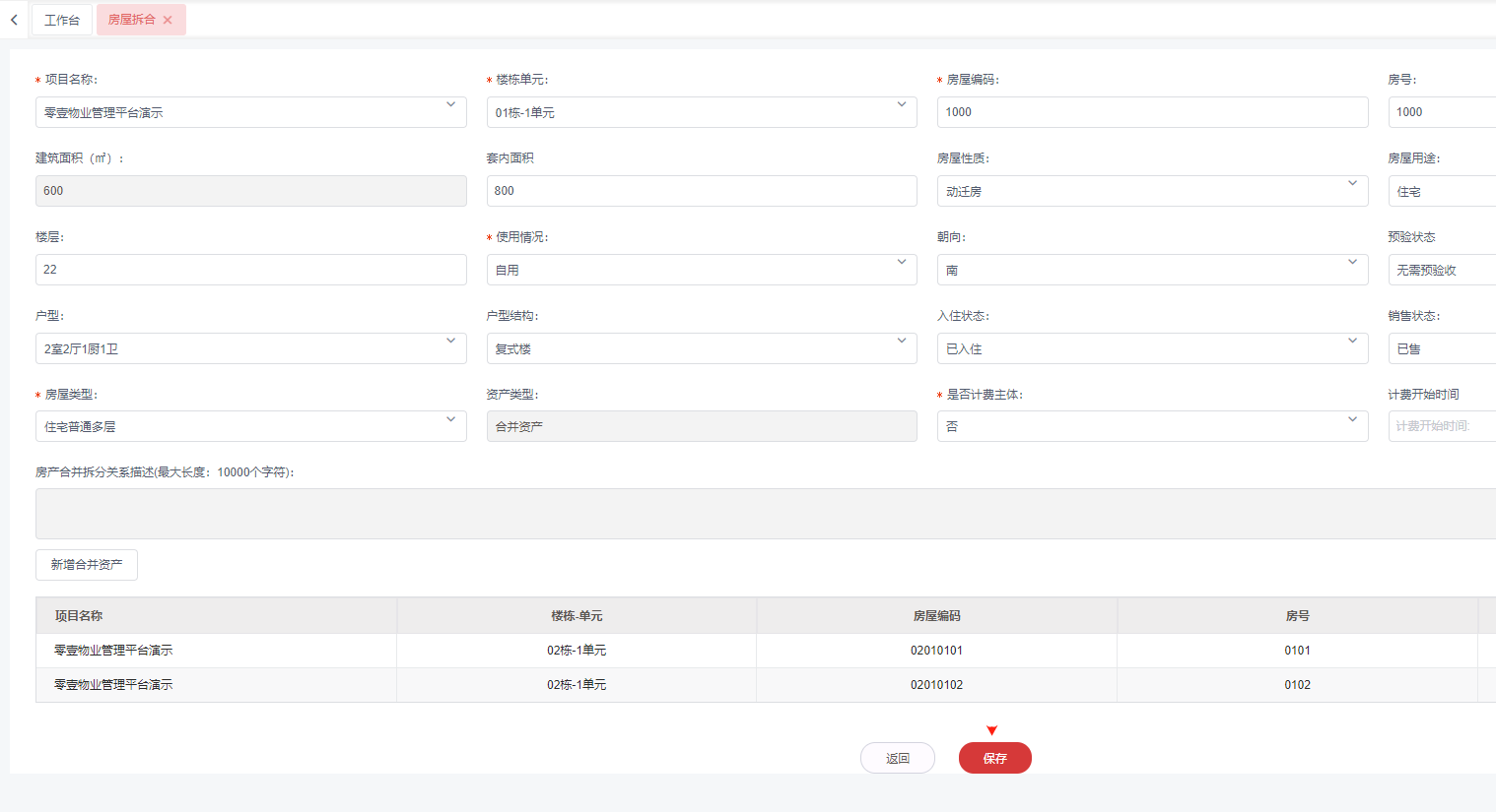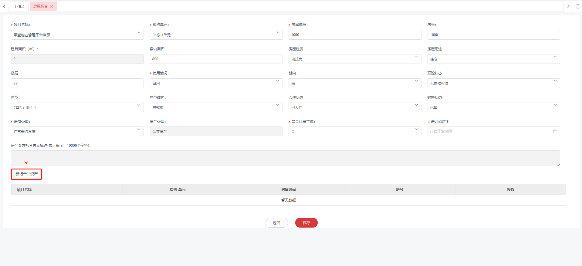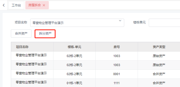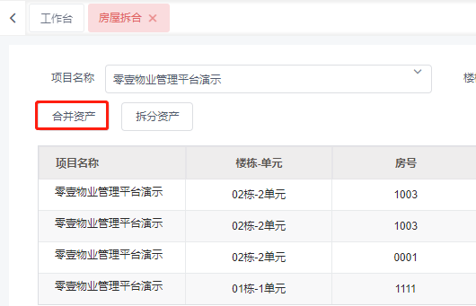 一个业主拥有多个房产,为方便计费、缴费等操作,需对资产进行合并、拆分处理。