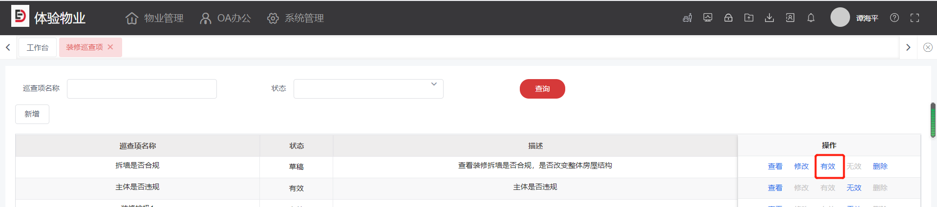 4.在操作域中将巡查项状态置为“有效”,在配置装修巡查方案时可关联状态为“有效”的装修巡查项信息