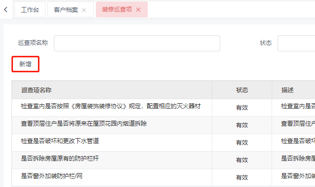 1.点击菜单:**物业管理 > 客户服务 >房产服务> 装修巡查项**。