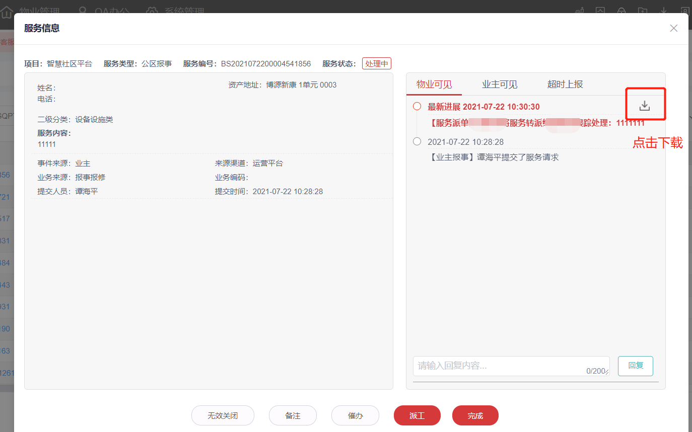 2. 点击需要派工的服务编号链接,进入服务详情界面。