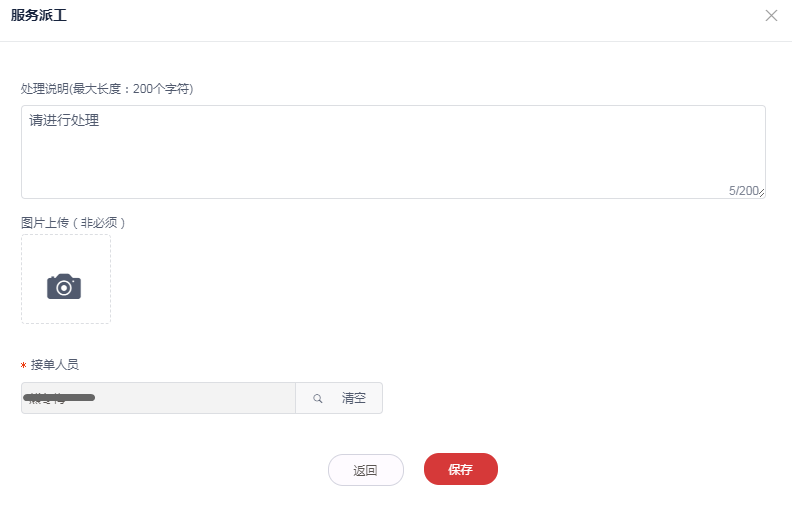 服务信息录入后,如果需要派工,客服人员可通过派工指定责任人处理。