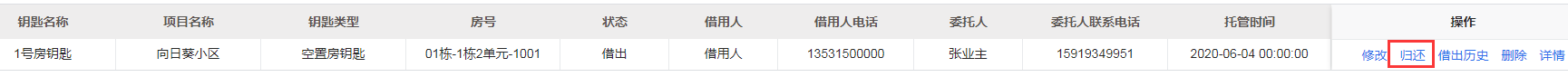 3.在列表中点击借出状态钥匙记录后操作列的**归还**