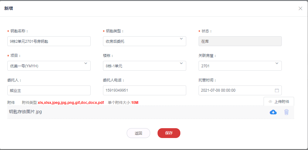 4.新增成功,可于列表查询到该钥匙记录