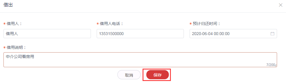 4.填写所有借用信息后点击**保存**按钮