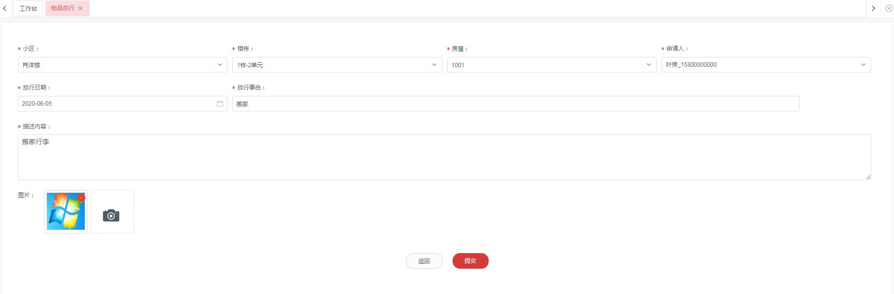3.填入申请人的房屋信息、申请人姓名、放行日期、放行事由、描述内容等数据,点击提交