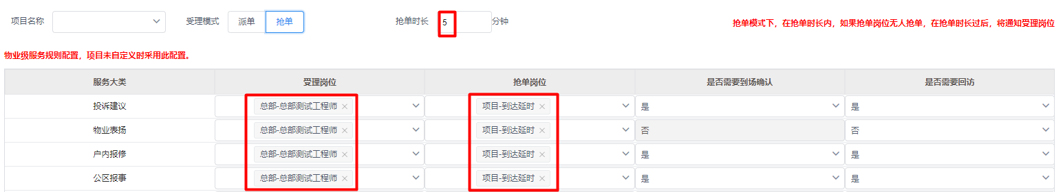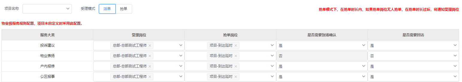 B. 报事报修规则支持物业级配置和项目级配置。当项目名称下拉框没有值时,查询出的是物业级配置;当项目名称下拉框选中一个项目时,查询的是对应项目的配置。项目级配置高于物业级配置。