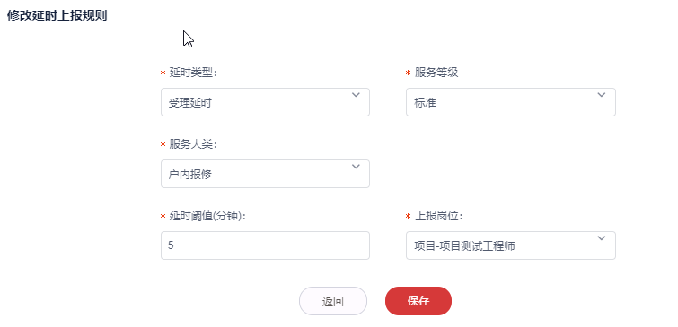 1. 单击延时上报规则配置页签。您可以修改各上报岗位和阈值 。