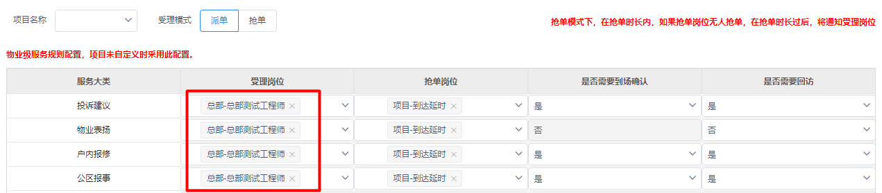 受理模式:派单,当新增服务后,由受理岗位的员工进行派单处理。抢单,当新增服务后,抢单岗位的员工可在指定时间内进行抢单。超过抢单时间后还未被抢的单,将进入派单流程。