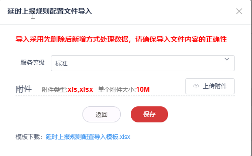 1. 单击批量导入。每次只能设置一种服务等级的规则,请先选择服务等级,再点击**延时上报规则配置导入模板**,系统将符合指定服务等级的数据导出生成模板。