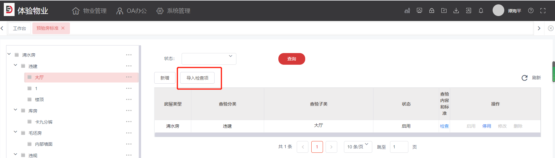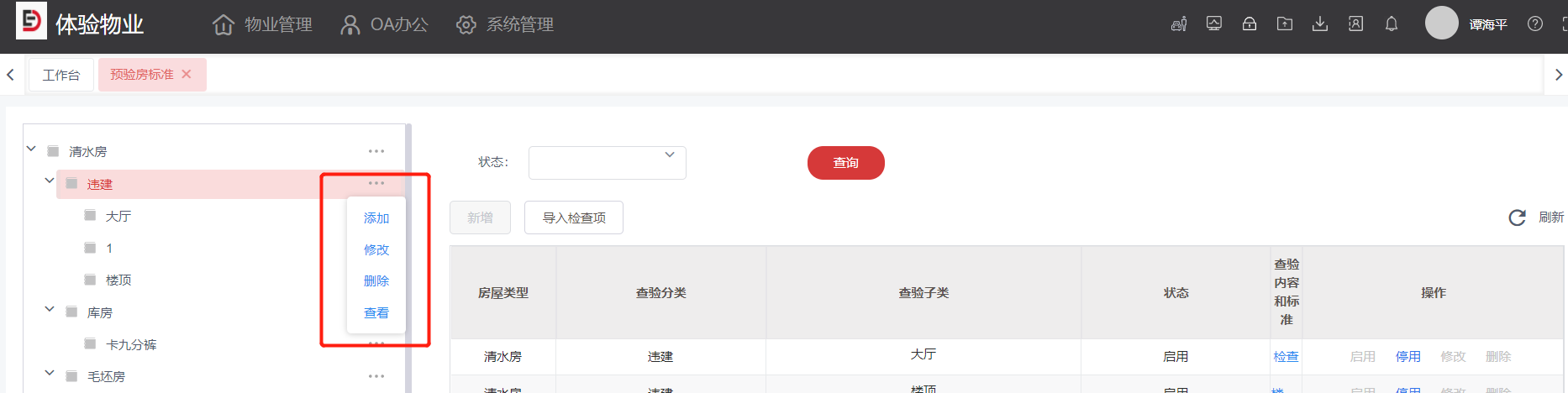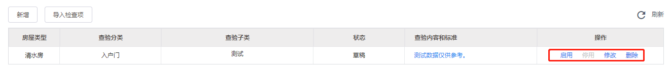 5.可在操作域对预验房标准进行停启用,删除,修改操作