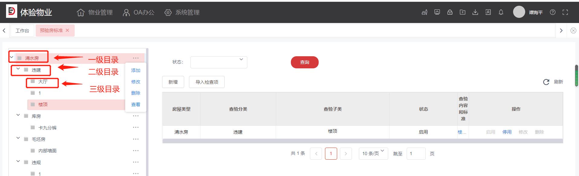 (规则:在根目录点击“+”按钮新增分类目录,以此类推,最多可新增三级分类,预验房标准只能在第三级目录下新增)