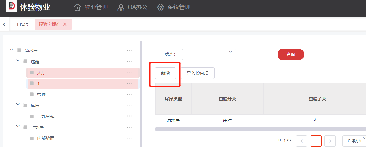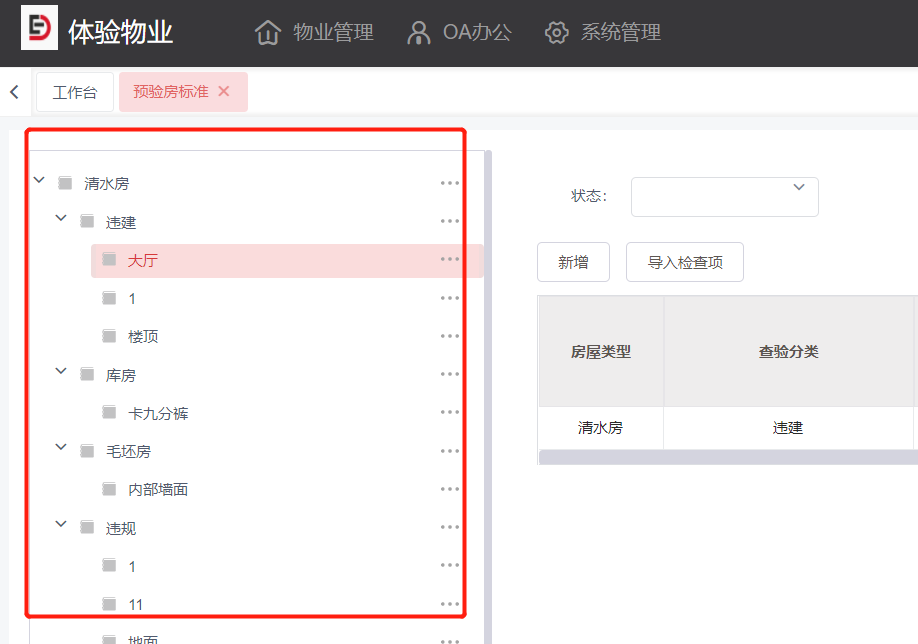 1.点击菜单:**物业管理 > 前介管理 > 预验房 > 预验房标准**