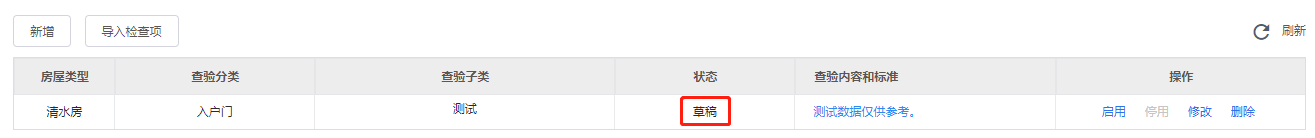 4.保存成功后,可在列表查看预验房标准信息,初始状态为草稿