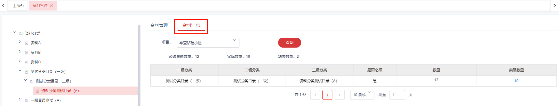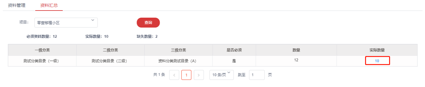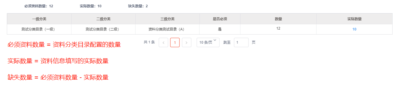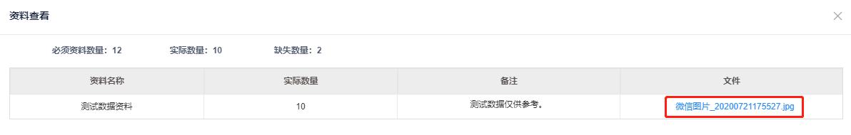 3.资料汇总页签可查看**必须资料数量,实际资料数量,缺失资料数量**