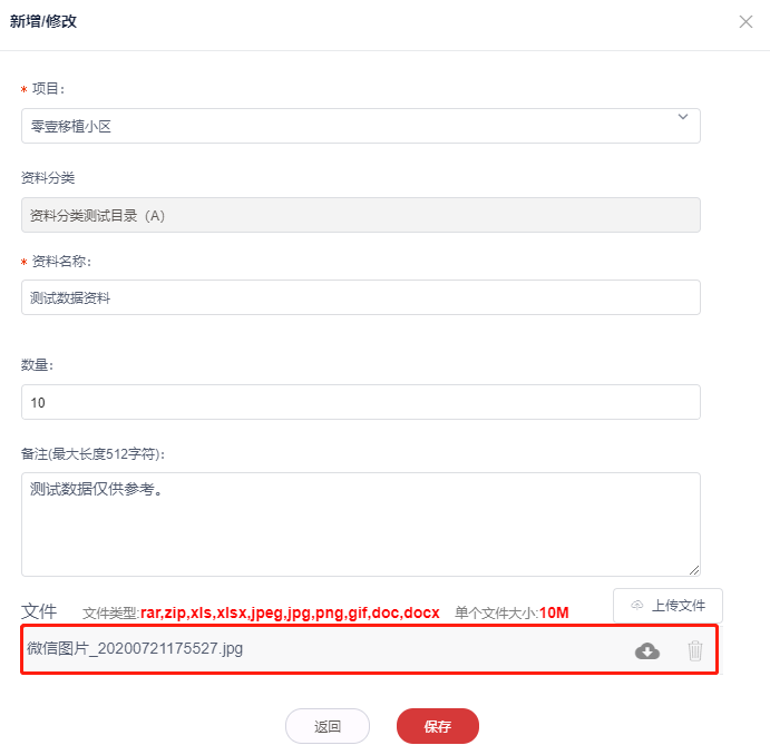 4.保存成功后,资料信息展示在对于目录下的资料列表