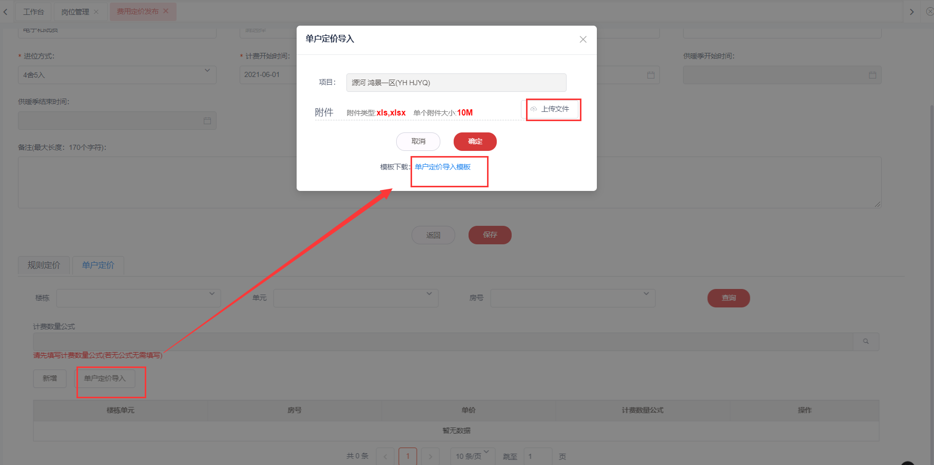 3.如果是批量导入多户的定价,则点击单户定价导入,点击“单户定价导入模板”,下载模板填写好数据,然后点击“上传文件,点击确定。即可导入多户的定价方案。