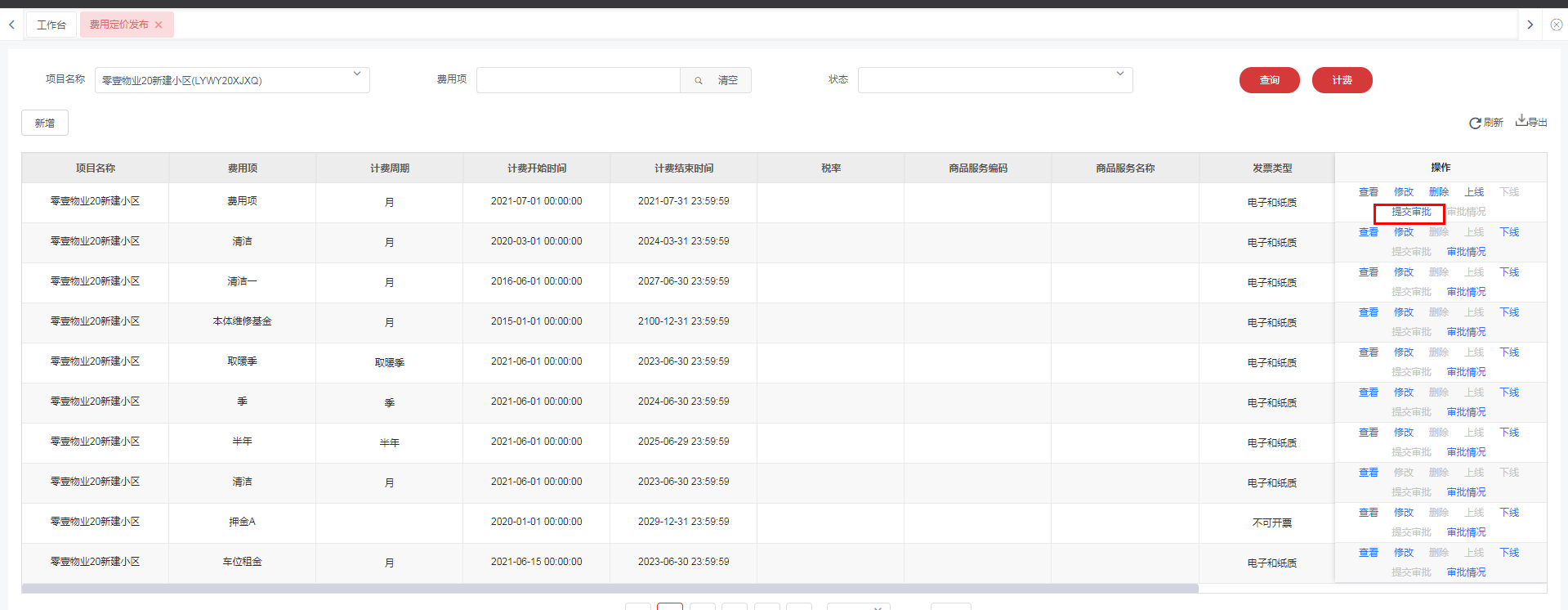 3.等待审批通过,通过后费用定价变为上线状态,上线状态可进行计费。