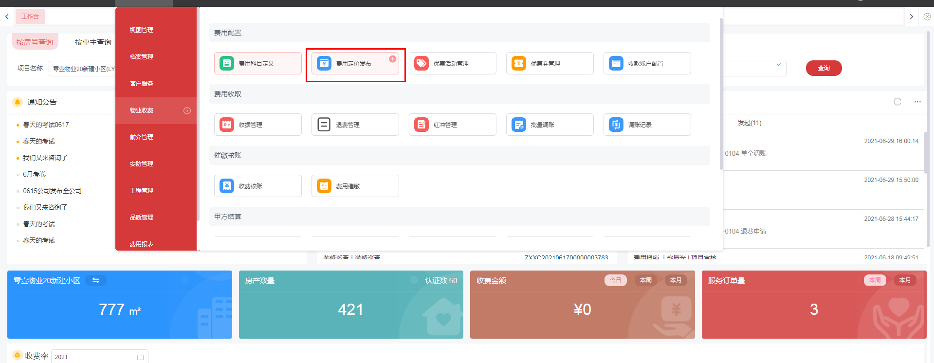 1.点击菜单:**物业收费 > 费用配置 > 费用定价发布**。