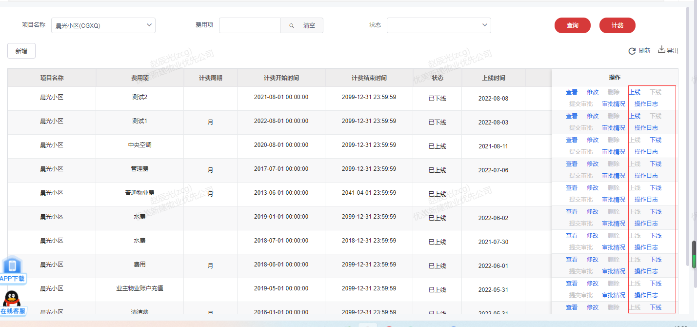 ## **三、费用定价上、下线、操作日志:**