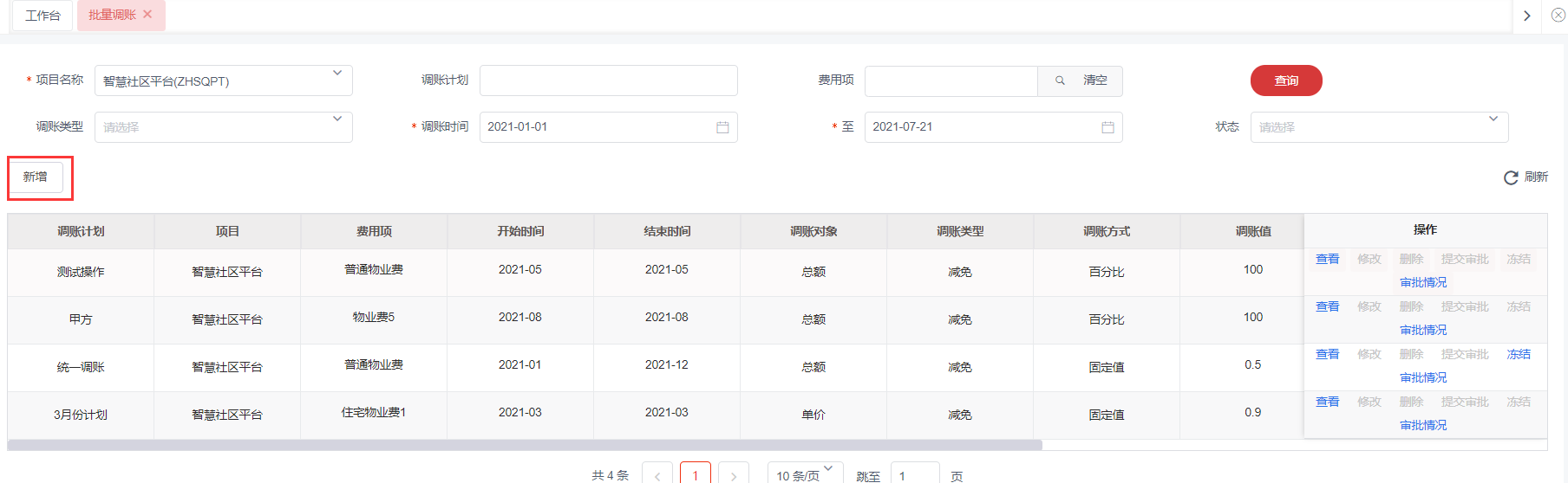 1.点击菜单:**物业管理>物业收费>批量调账**