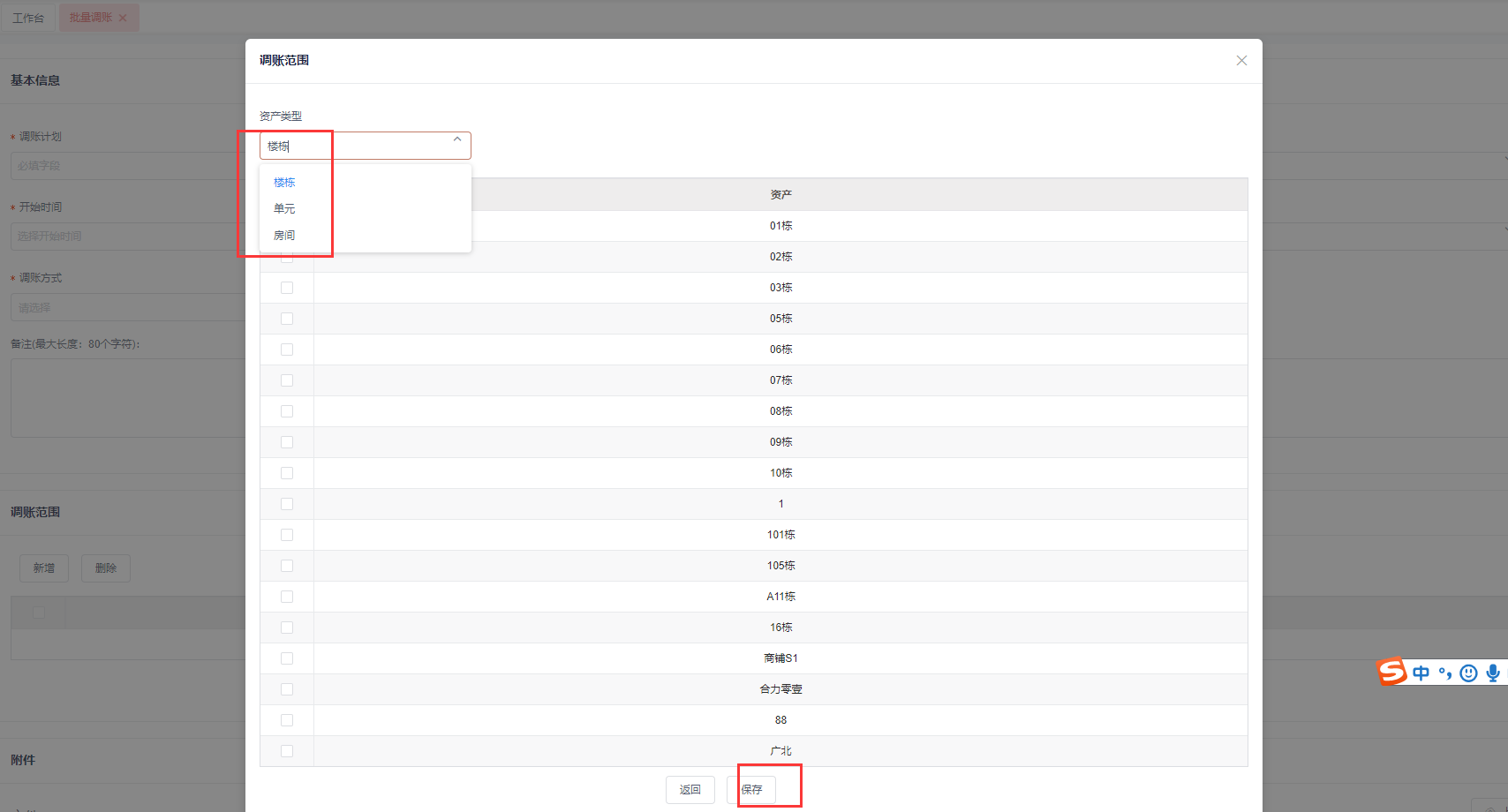 *调账范围可按照楼栋、单元、房号进行多项选择。