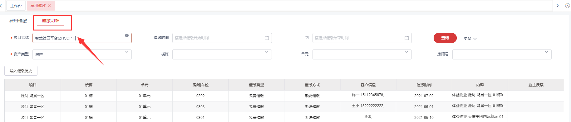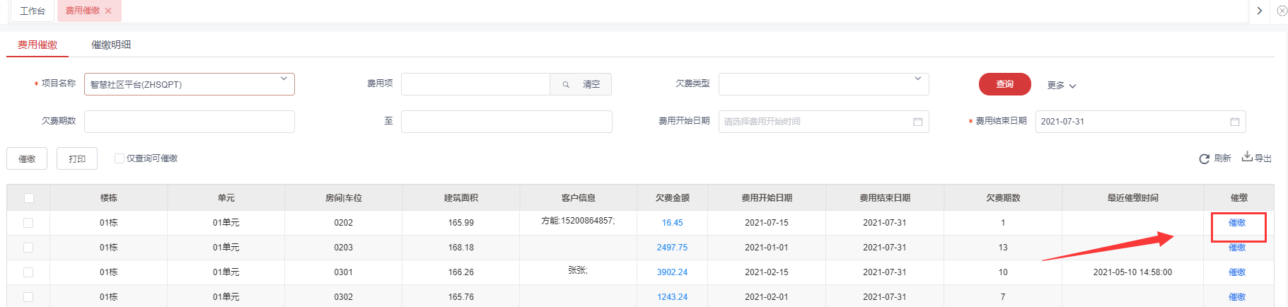 2.在费用催缴页签输入查询条件后点击**查询**按钮
